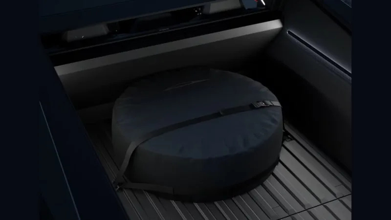 As the website says, “All-terrain tires have you covered in any environment. Bring a spare tire for when you go where roadside assistance can’t.” It then shows a picture of an enormous tire taking up half the truck bed. This basically just says, “The Cybertruck does not have a standard spare tire, unlike the Rivian, Ford Lightning and (insert name of other truck), and even if you opt for one, it’s a serious compromise.”