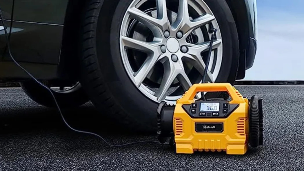 This AstroAI portable air compressor comes with three nozzles and will work with any Schrader valve on cars, SUVs, motorcycles, and bicycles. It can pump up tires at a speed of 35 L/Min and can inflate 195/55/R15 tires from 0 to 35 psi in under 5 minutes. The gauge is professionally calibrated to show a reading within 1.5% of your actual tire pressure and is even programmable, so you can just set your desired pressure and let the machine do the work. It’s got a large, backlit screen that displays pressure units like PSI, kPa, BAR or KG/CM. There’s also a built-in flashlight for if you’re working in the dark. The included accessory adapters will also allow you to also use this inflator on balls, air mattresses, balloons, and other small inflatables.