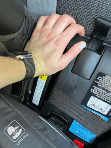 Adjust the seat to the necessary recline position according to your child’s weight and open the SnugLock lockoff. Route the vehicle seat belt through the lockoff, then buckle it in. Remove any excess slack in the seat belt and then close the lockoff. The seat should move less than one inch side to side and front to back when checked at the belt path with the force of a firm handshake with your non-dominant hand.