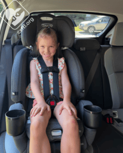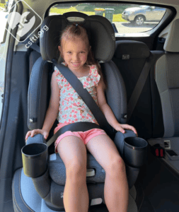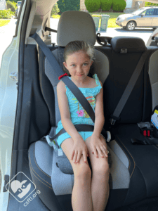 Here is the same kiddo using the seat in high back booster mode still weighing 40 pounds and standing 43 inches tall. She gets a great belt fit with the seat belt trainer in place.