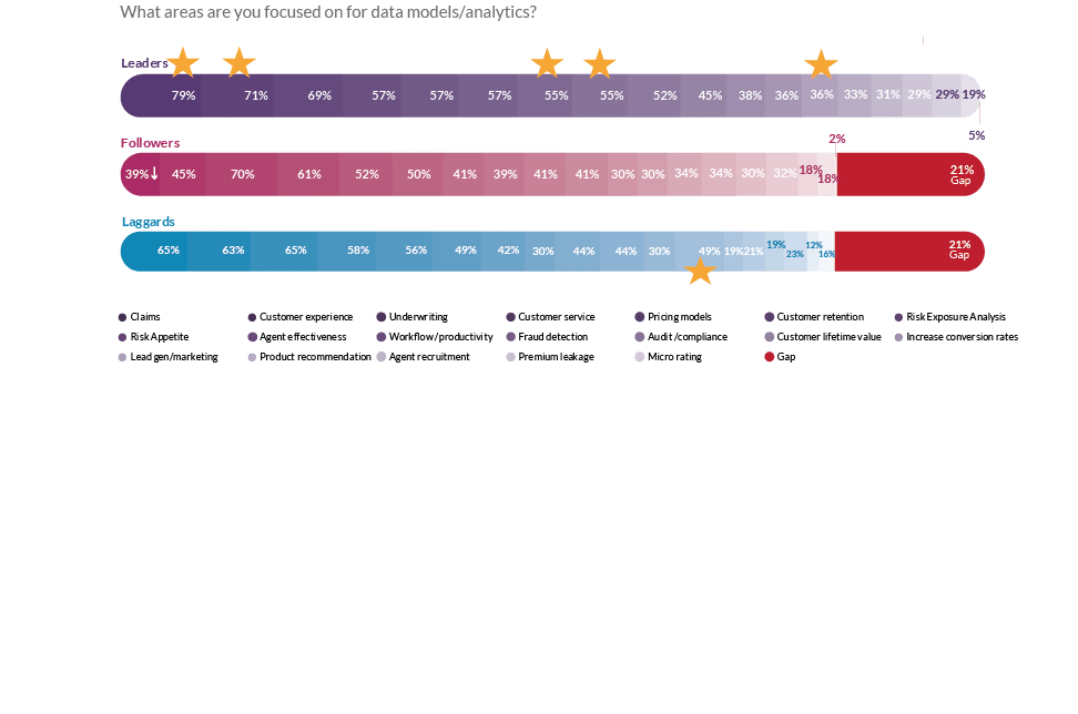 When looking at the difference between Leaders versus Followers and Laggards, the gaps are similar at 21%, but are driven by different relative weaknesses and strengths (See Figure 4). Laggards’ greatest gaps are risk appetite (25%), customer lifetime value (17%), and agent recruitment (17%), but they lead Leaders and Followers for Audit/compliance (13%, 19%). Interestingly, Followers are the weakest in claims (40%), customer experience (26%), and risk appetite (16%), all crucial areas to drive overall profitability.