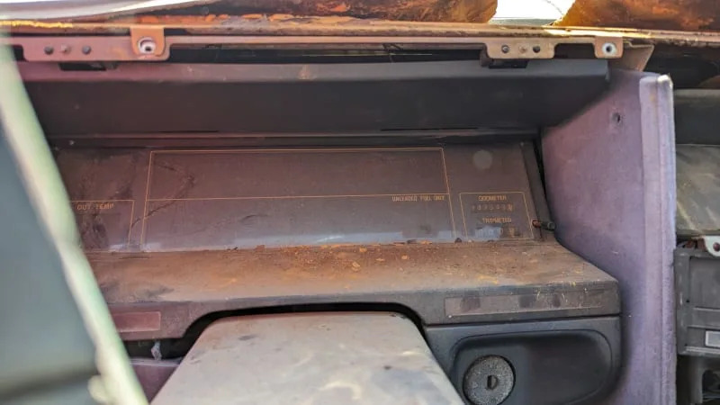 This car has the science-fiction-style digital gauge cluster, which looked like a video game in action. I’ve already got one in my collection of 1980s digital dashes, so I left this one in the junkyard. The odometer here reads 147,643 miles.
