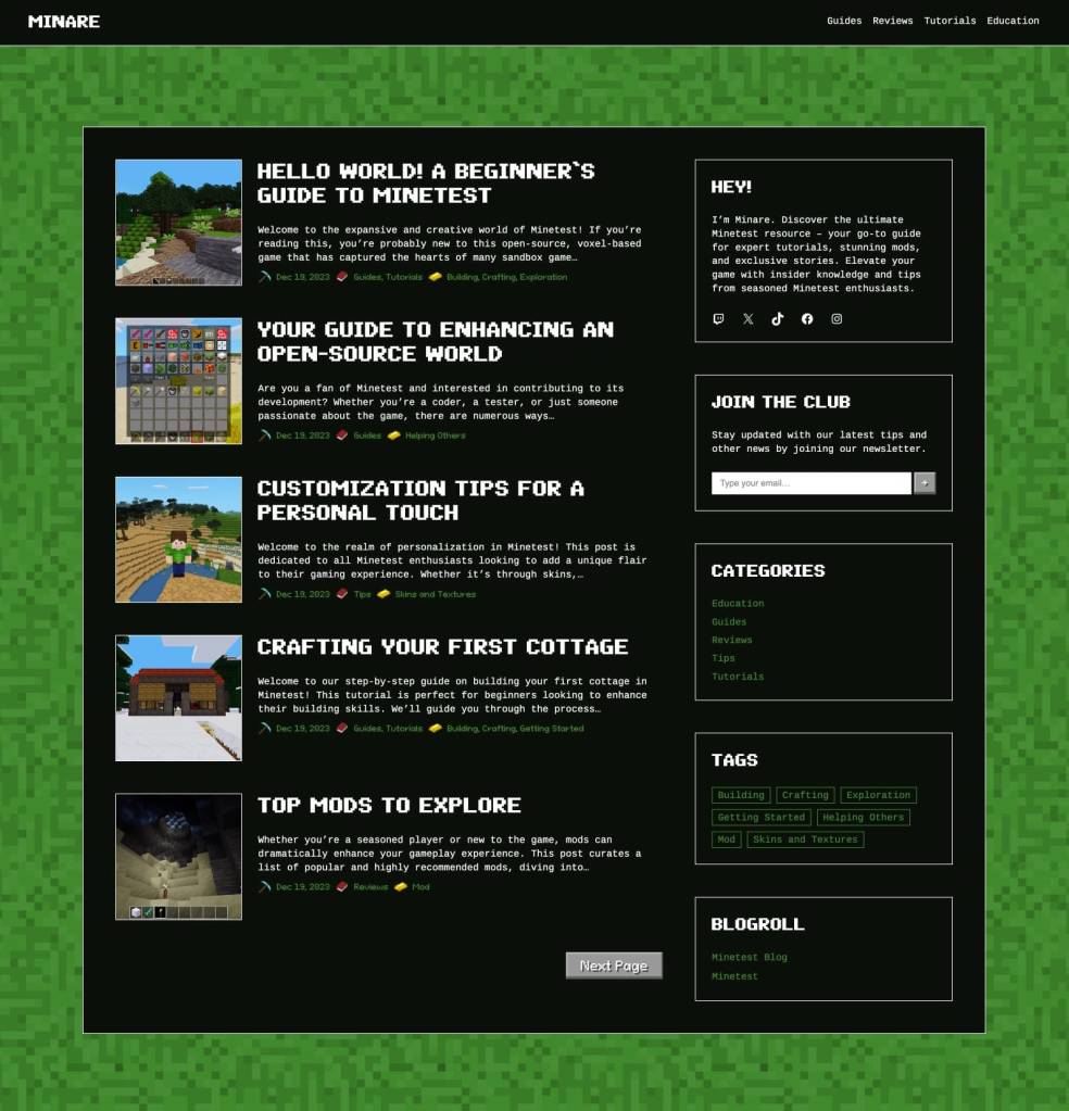 Inspired by the iconic worlds of Minecraft and Minetest (an open-source game engine), this blogging theme was designed to replicate the immersive experience of these games. While encapsulating the essence of virtual realms, we also wanted to ensure that the theme resonated with the Minecraft aesthetic regardless of the content it hosts.