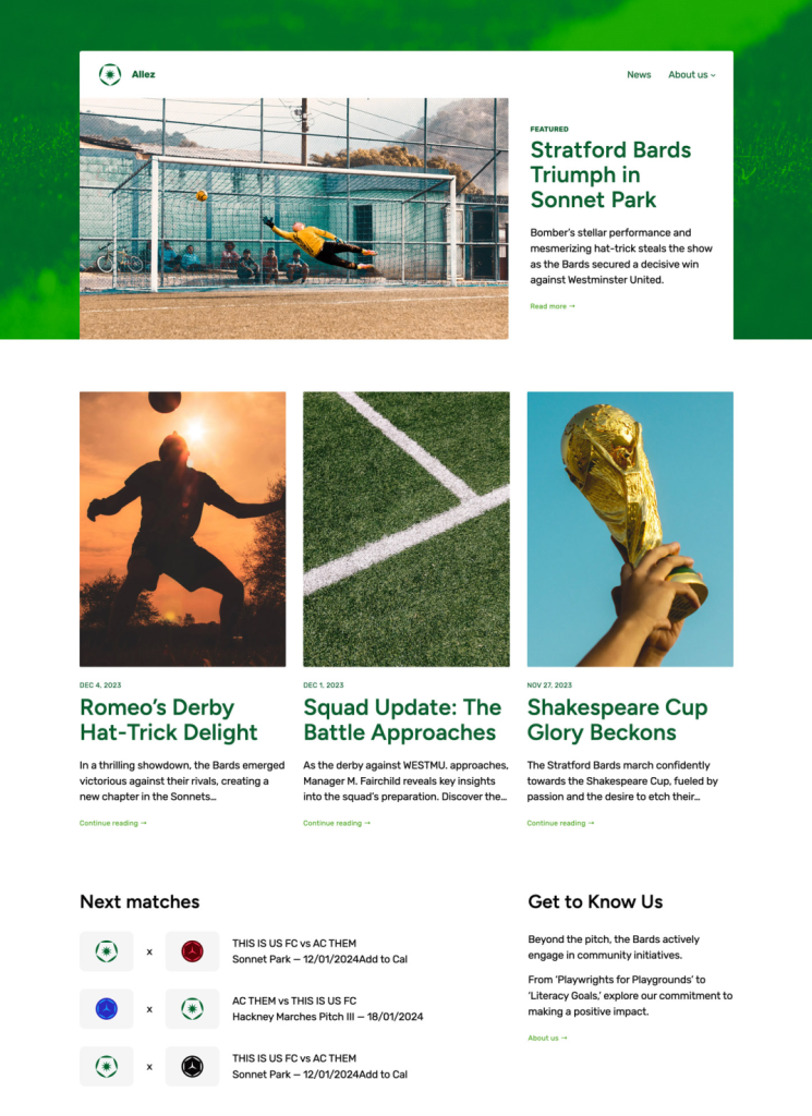Whether you’re a casual observer or a diehard rain-or-shine follower, fandom means a lot of things to a lot of people. Allez is a perfect theme to chronicle that part of who you are. Built with sports-focused content in mind, the layout, styling, and patterns used all speak to that niche. That said, WordPress is versatile enough that if you like the overall feel of Allez, it can easily be customized to your particular endeavor.