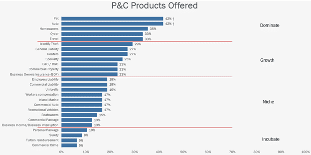Before we looked at channels in depth, we wanted to understand which products were being offered by our survey group. P&C products were offered by fewer respondents, so we aligned categories to represent use within the P&C segment (see Figure 2). The four categories we used to describe product adoption zones were: