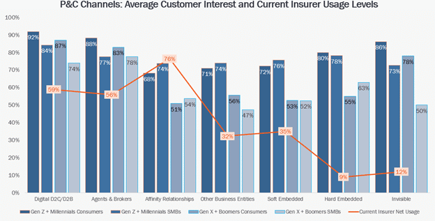 There are a wide array of opportunities in P&C when comparing channel usage relative to consumer and SMB customer interest. There is already a strong alignment between Gen Z & Millennials in Affinity Relationships. In particular, the most significant opportunities include Digital (33%+); Agents & Brokers (32%); Other Business Entities (42%); Soft Embedded (41%); Hard Embedded (71%); and Invisible Embedded (74%).