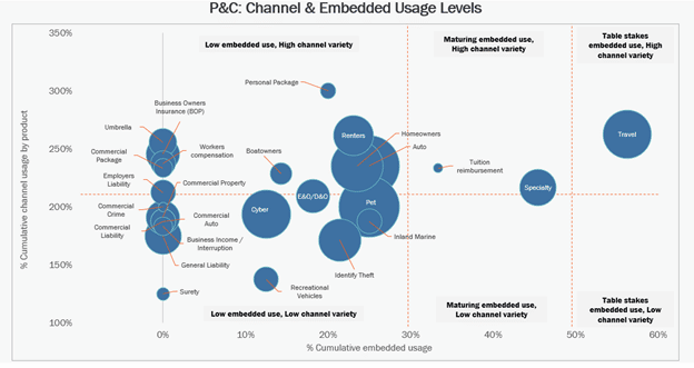 Figure 6: Market opportunities for P&C products based on product popularity, channel variety, and embedded usage