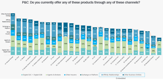 While P&C has been at the forefront of digital transformation, outpacing L&AH over the last decade, they are not outpacing in terms of channel breadth and use. This puts P&C well behind L&AH in using embedded options…not a good thing given the high interest! Twelve of the 26 (46%) P&C products had no reported embedded usage.