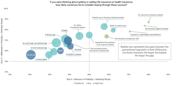 The top 3 traditional channels with the smallest bubbles (insurance website, agents/brokers, affinity groups) are in the upper right-hand corner indicating the same preference level for both generational segments. Moving left, Gen X and Boomer ratings rapidly decline while Gen Z and Millennial ratings remain in a tighter range. At the same time, the gaps between the generations grow larger indicated by the increasing bubble sizes.