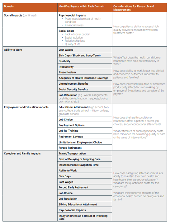 Direct Medical Costs: Patient or caregiver costs paid to a healthcare provider or healthcare system.Non-Clinical Healthcare Costs: Costs that are a direct result of seeking treatment but are not paid into the healthcare system.Social Impacts: Economic impacts that may have less obvious measures but have downstream impacts like time spent negotiating with insurance companies, compounding financial impacts, or access to social services.Ability to Work: Traditional work measures like productivity, sick days, and days off from work.Education and Job Attainment: Impacts such as career choice or educational attainment.Caregiver and Family Impacts: These are the economic impacts that caregivers experience because of the primary patient’s illness or health condition
