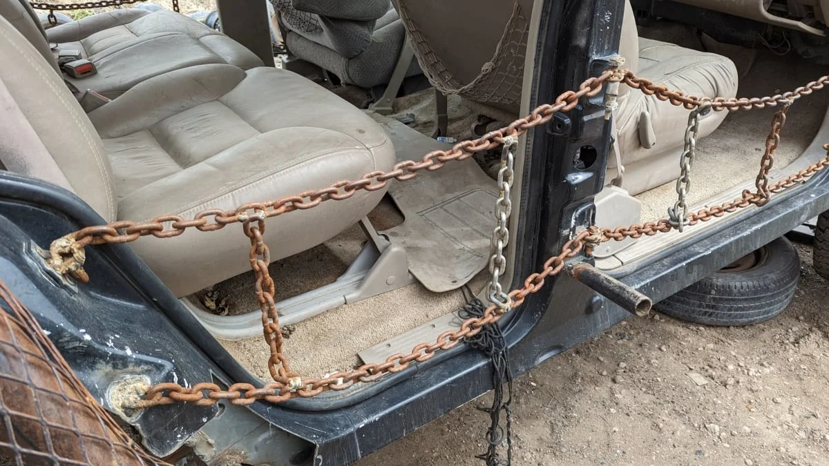 I hope all occupants wore their seatbelts, because these chains don’t look like they’d have been able to keep anyone safely inside on a jouncy mountain trail.