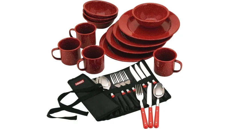 Includes 4 dinner plates, 4 coffee mugs, 4 bowls and a silverware set with 4 plastic-handled forks, spoons, and knives in a roll-up pouch