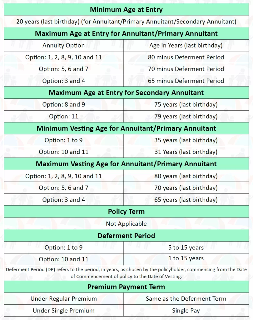 Guaranteed annuity from inceptionHigher annuity rates at higher agesLife cover during the deferment periodOption for regular and single premium paymentEnhanced benefits for existing LIC Policyholders