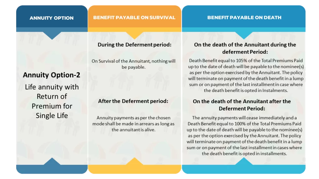 Survival and death bene in Jeevan Dhara 2 differ according to the Annuity Option chosen by the proposer when taking the policy. Survival benefit and death benefits of varying annuity options are given below: