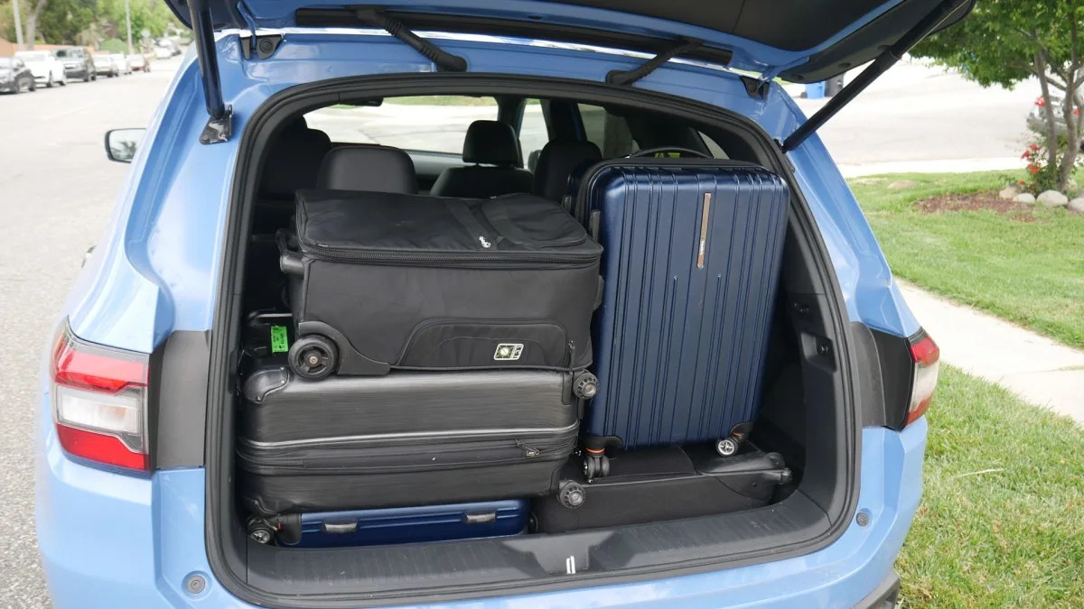 Well, the TX can swallow all the bags, so that’s off the table. The Volvo XC90 only managed the four smallest bags, the Cadillac XT6 could only squeeze blue/green and a black roll-aboard, and the Mazda CX-90, which I think is a fair comparison, matched the Volvo. There’s also the Lexus GX, which exceeded expectations, but still is pretty lousy.