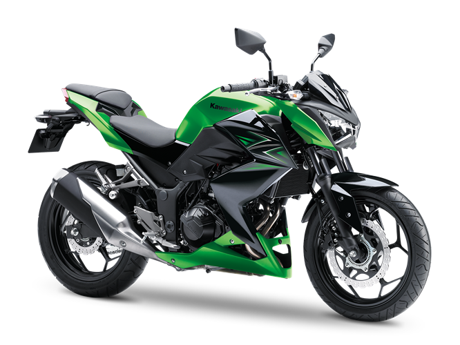 The Kawasaki Z300 weighs a modest 170kg and is available in Candy Flat Blazed Green and Metallic Spa.