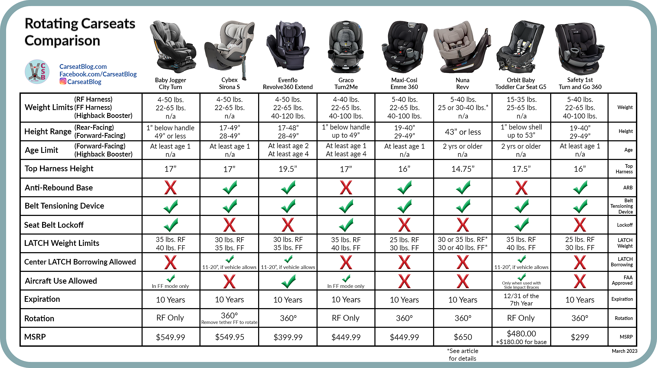 2023 Rotating Car Seat Comparison Chart