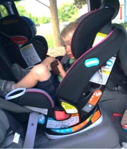 There are technically 3 positions for forward-facing, (4-6) but position #4, which is the most reclined of the three forward-facing positions, MUST be used for children who weigh less than 40 lbs. In position 4, the seat is quite reclined. This didn’t pose an installation problem in either car, although in a very small backseat there might not be enough room for a child’s legs in that most reclined forward-facing position.