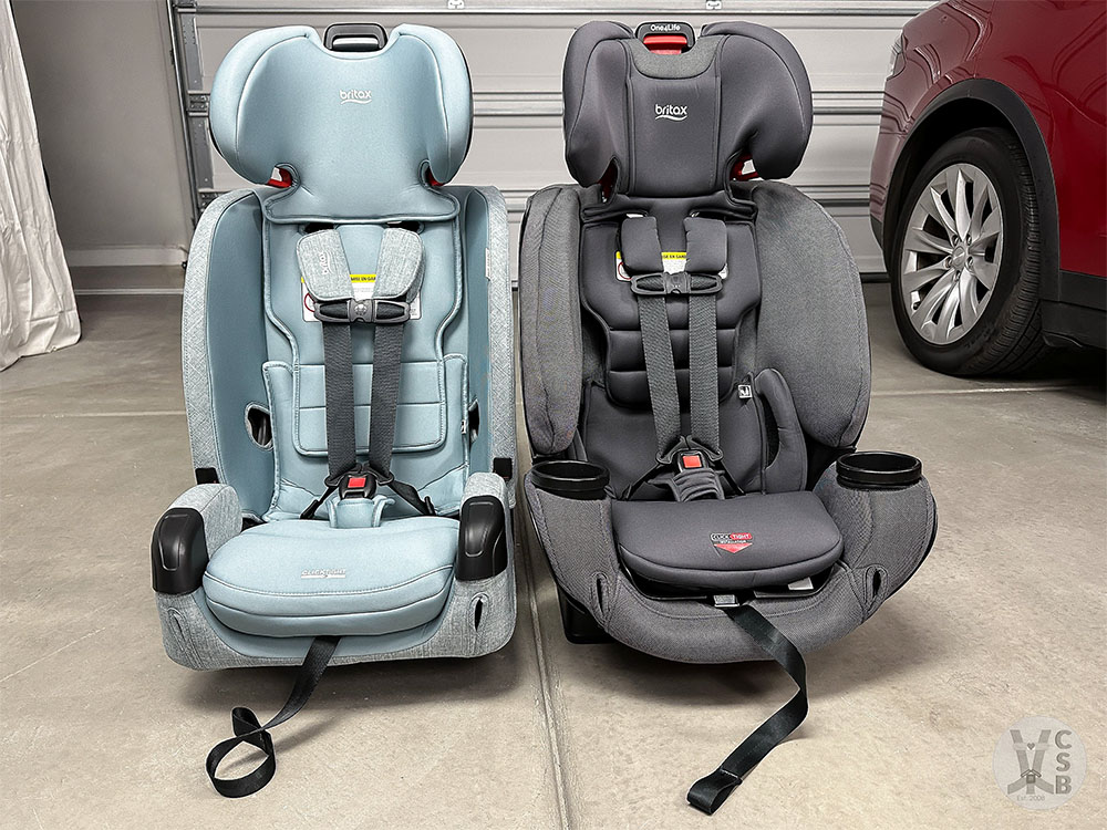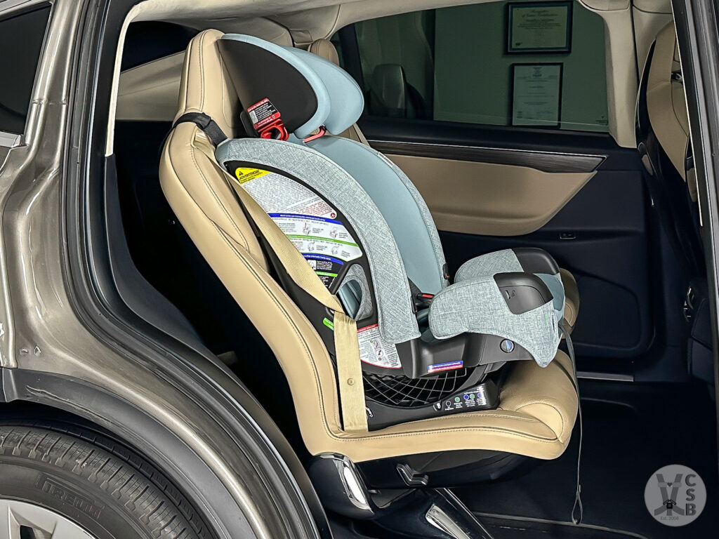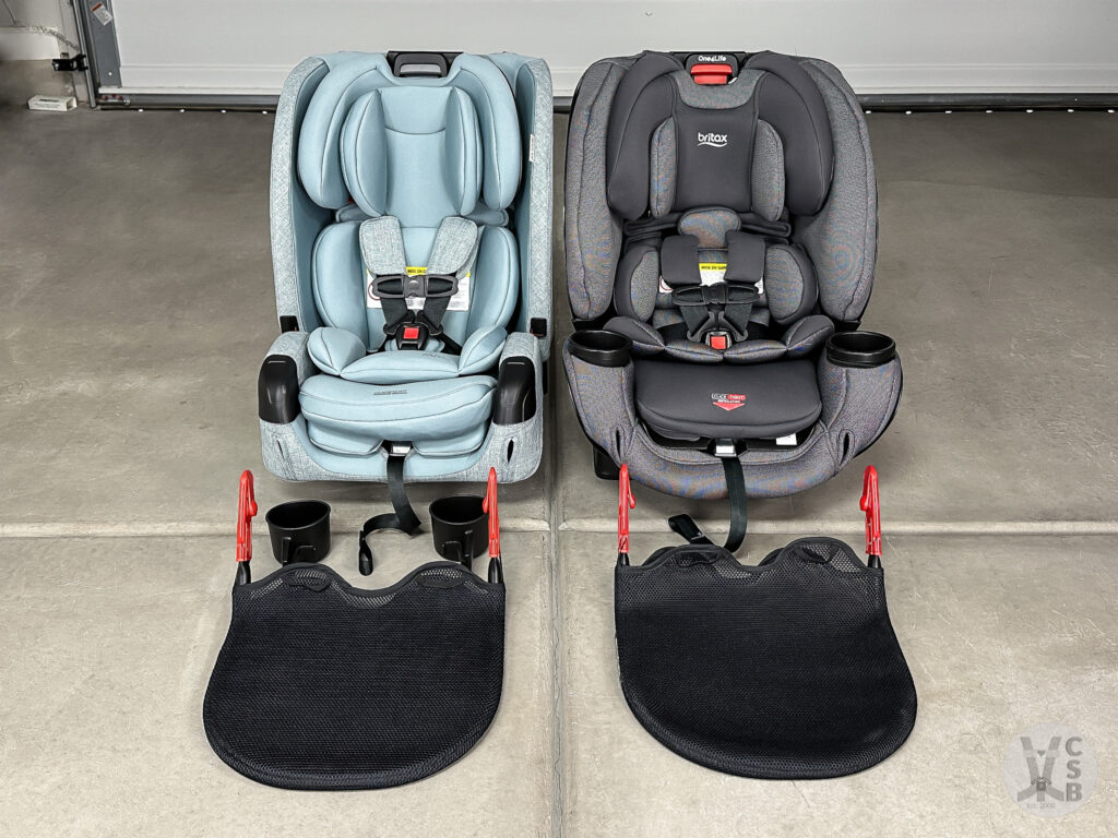 Britax allows the base of the One4Life Slim to hang over the front edge of the vehicle seat by up to 3″ when it’s used in harness mode. Side overhang is not allowed. When it’s in booster mode, though, no overhang is allowed and the entire base of the car seat must be on the vehicle seat.