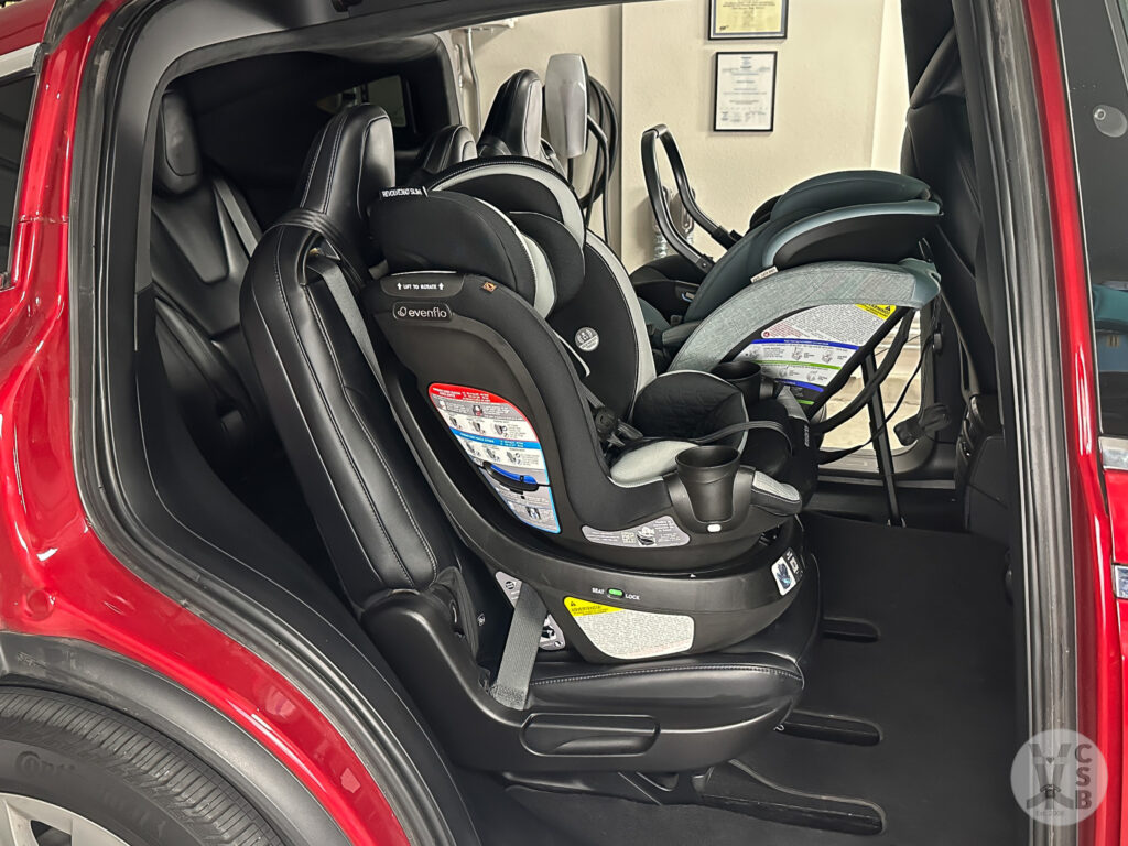 It’s rear-facing in the middle here between an Evenflo Revolve360 Slim and an UPPAbaby Aria: