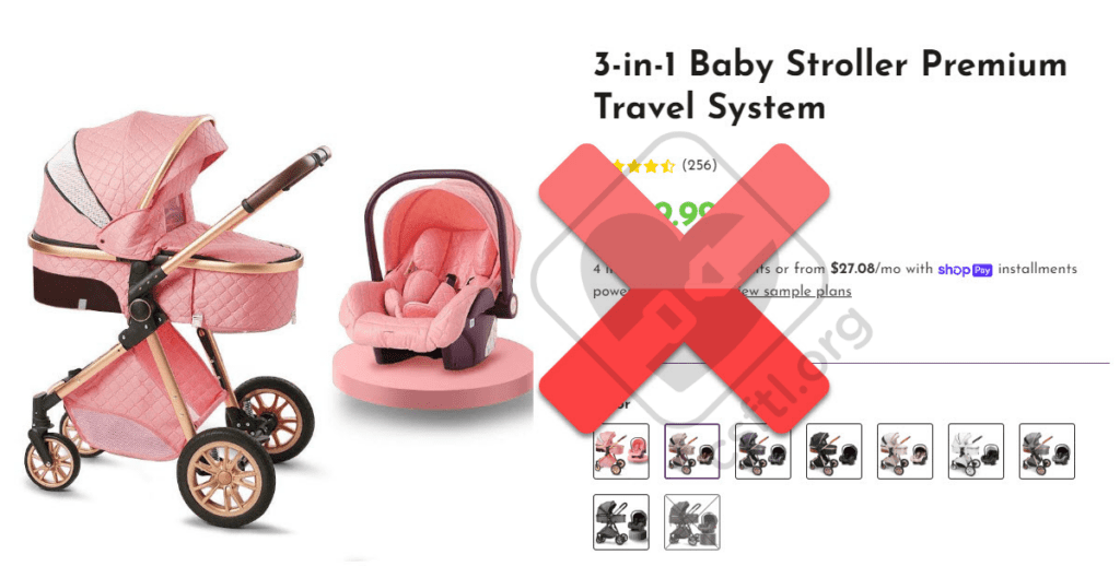 A counterfeit rear facing only car seat set marketed as a luxury travel system with a “baby seat”.