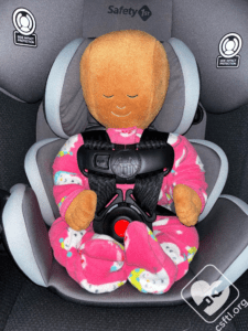 This newborn Huggable Images doll weighs 7 pounds and is 17 inches long. The harness is routed for smaller children and the first crotch buckle slot is in use. Per the manual, we used both the head and body inserts. The harness fit the doll well here, it’s always a bonus when a multimode or convertible car seat could fit the tiniest of passengers well!