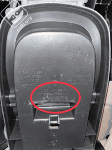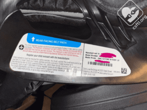 The date of manufacture label is located on the shell of the seat, near the child’s left hip.