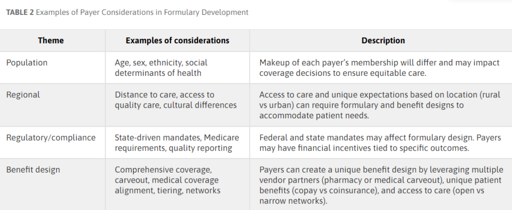 What considerations do payers take into account when developing a formulary?