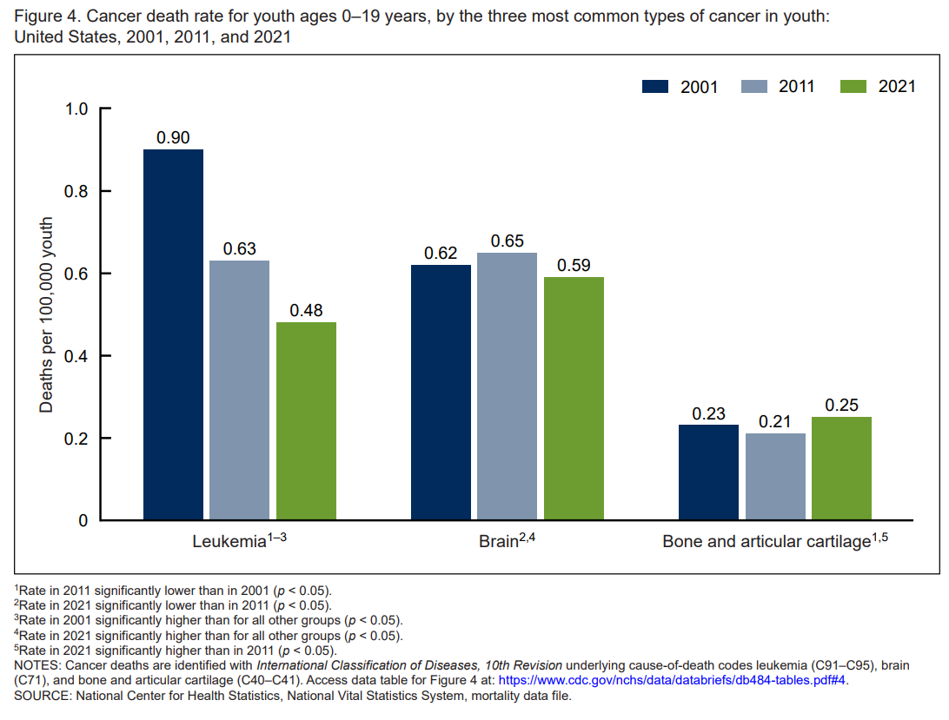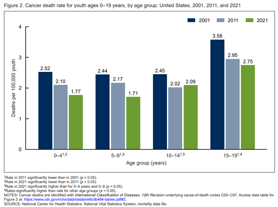 That is the finding from a CDC report released this month. Mortality rates fell by 24% between 2001 and 2021. Specifically, the cancer death rate for youth ages 0–19 years was 2.75 per 100,000 in 2001, but decrease to 2.10 per 100,000 in 2021.