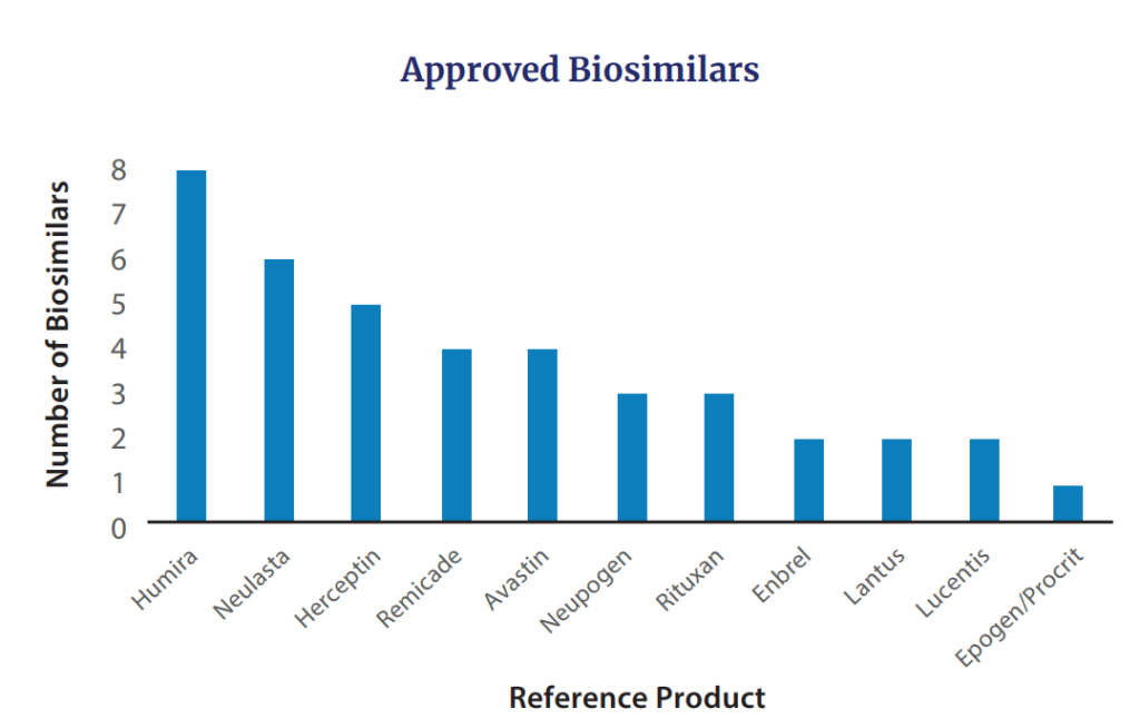 Additionally, in 2022 FDA approved seven biosimilars for products including Avastin (n=2), Humira, Lucentis, Neulasta (n=2), and Neupogen. The cumuulative biosimilars approved by FDA to date are in the figure below.