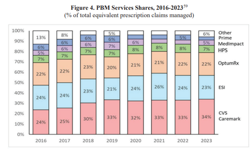 The market share of the 3 largest PBMs (CVS Caremark, Express Scripts (ESI), and OptumRx) increased from 70% to 79% of the PBM market.