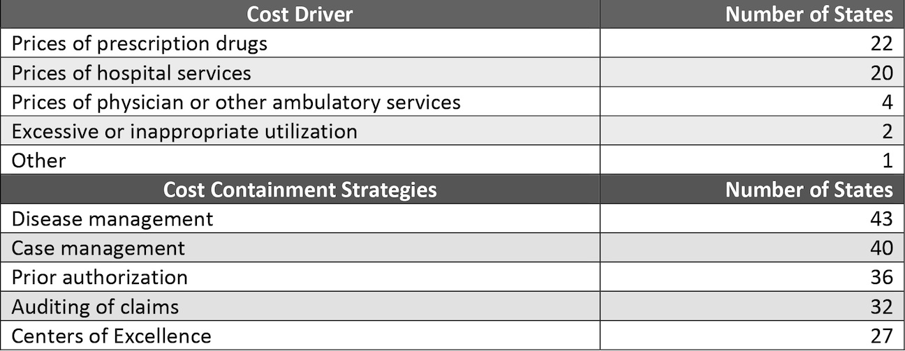 Source: Authors’ analysis of survey responses from 50 state employee health plan administrators. Notes: Forty-eight states responded to the question about cost drivers. Forty-six states responded to the question on cost containment strategies, and states could identify multiple initiatives.