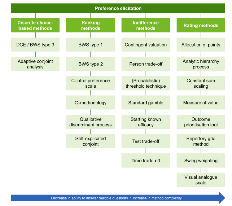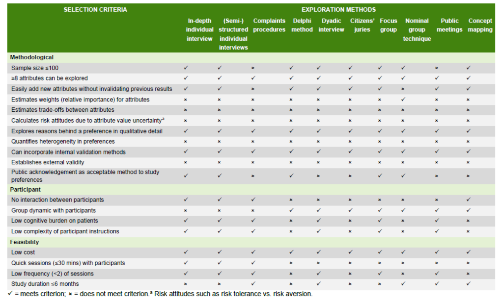 importance of outcomes or attributes is often conducted using qualitative methods. These qualitative methods are often best-suited for early phases in the medical product life cycle. Relevant methods include:
