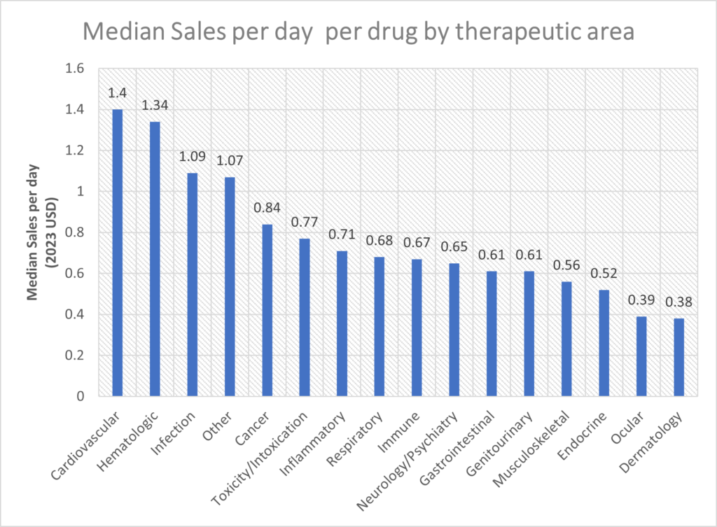 Cardiovascular, hematology, infection and oncology drugs had the highest sales per day based on median sales per day.