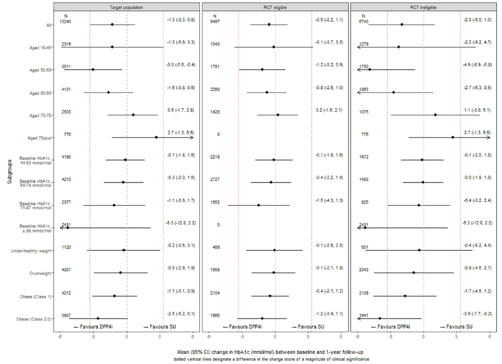 This is the question a paper by Lugo-Palacios et al. (2024) aims to answer. The goal of their study is to determine which second-line treatment for type 2 diabetes is most effective in the real world. To do this, the authors estimate the average treatment effect (ATEs) and conditional average treatment effect (CATE) for the use of dipeptidyl peptidase‐4 inhibitors (DPP4i) and sulfonylureas (SU) as ‘add on’ therapies to metformin for the treatment of patients with type 2 diabetes in England. The primary endpoint of interest was glycemic control. One challenge is, that published RCTs report do not have a consensus recommendation; some find superior improvement with SUs and others with DPP4i. As mentioned above, one problem is that RCTs evaluating these treatments is that they often exclude patients with very poor glycemic control and thus the extent to which different types of real-world patients would benefit from each treatment is unclear.