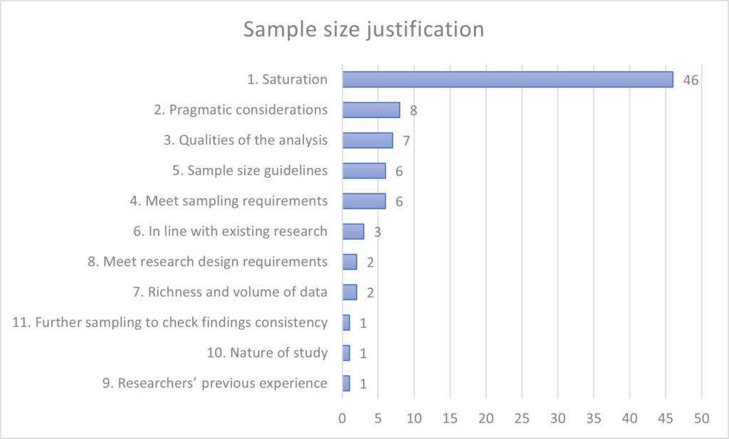 What rationale(s) did authors use to justify their sample size? Saturation was most common followed by pragmatic considerations.