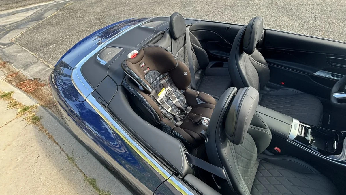 Even better, installing the car seat was surprisingly easy. Reading the manual is an absolute must as it shows you how to pop out the rear head restraint and therefore access the hole needed to pass through the car seat’s rear LATCH anchor strap. Once you know the trick, however, it was significantly easier than installing this same car seat in literally every pickup truck I’ve tested. OK, so again, having the roof down makes a big difference, but unless it’s raining …