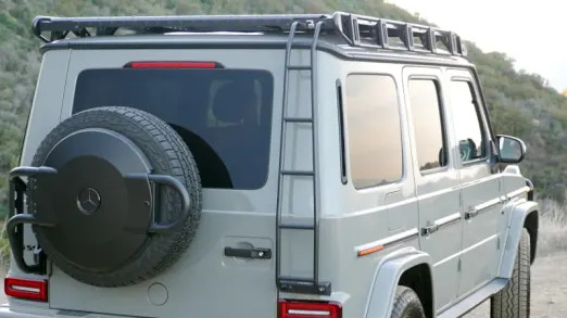 Rather than a distinct model or trim level, the Professional Edition is a $23,250 package. Many of its included elements can be had on any G 550, including gloss-black finishings for the grille, Benz star, brush guard and mirror housings, as well as 18-inch matte black wheels wearing all-terrain tires. Unique are the flush side sills in place of the usual running boards, the Professional Line spare wheel holder than can swing out separate from the tailgate, a wood cargo floor, and the most conspicuous element, the Professional roof rack/platform accessed by an also-added ladder.