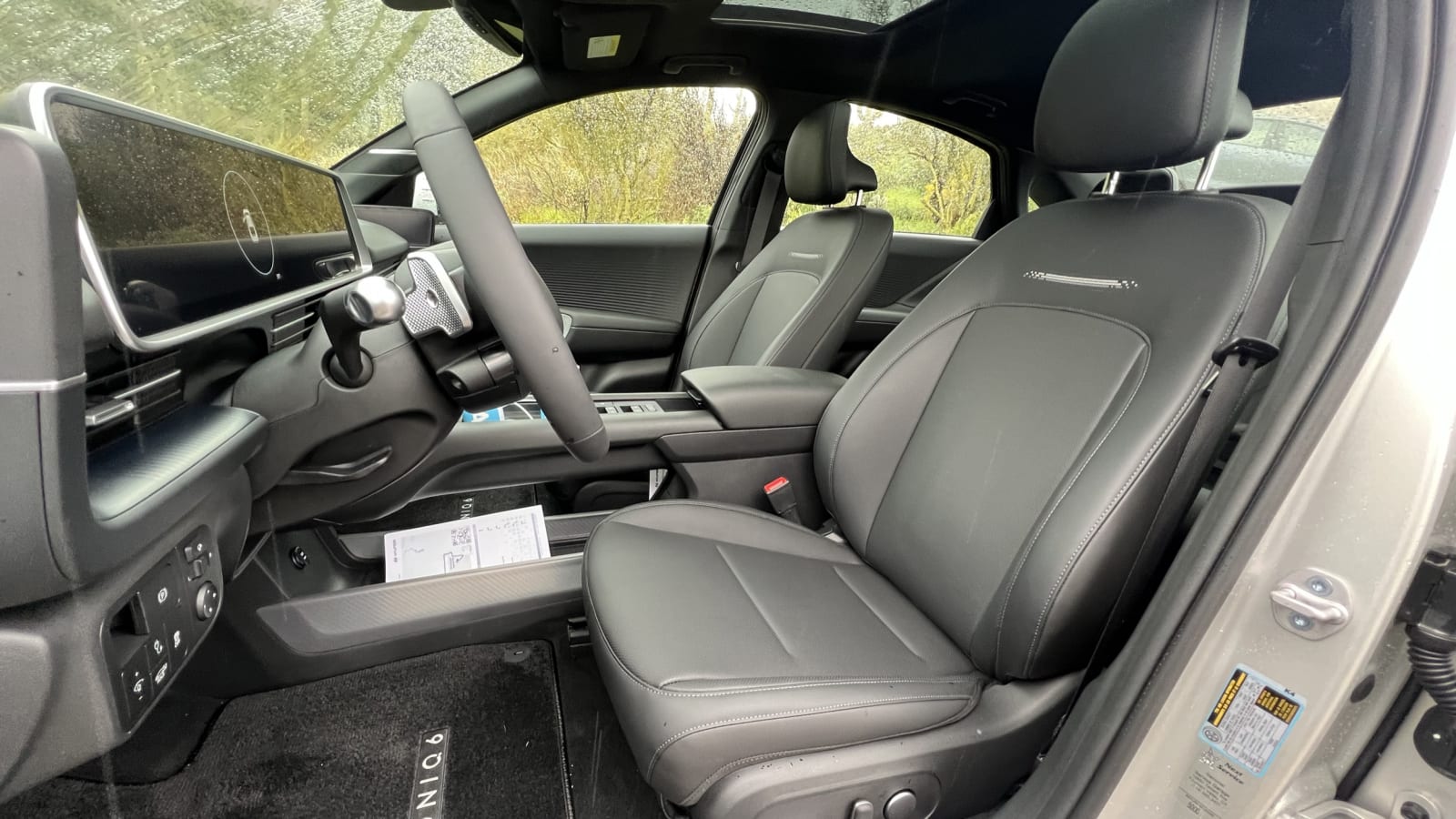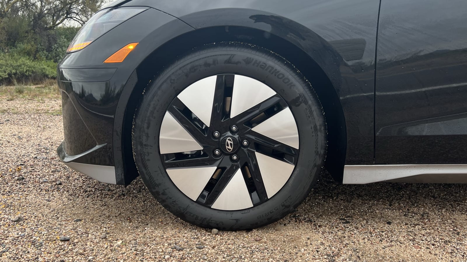 Later, we traded our top trim for the longest-range version of the Ioniq 6, the SE RWD with the same 77.4-kWh battery. From the exterior, there’s not much to help differentiate it from the AWD version apart from its 18-inch wheels. Inside, the SE swaps the Hi-Tex seating material for a simple cloth. It also ditches the sunroof, making the headroom situation slightly less cramped. The rest of the interior looked basically identical — same materials, same designs, same layout, even the same dual screens. It wasn’t until driving that the differences became apparent, in powertrain, of course, but also in absent tech features like the blind-spot camera, auto windshield wipers and heated steering wheel.