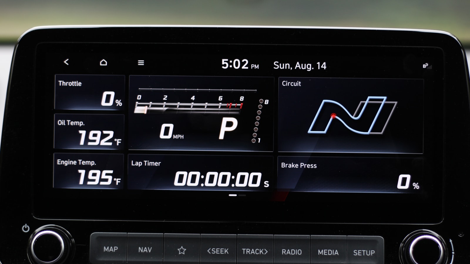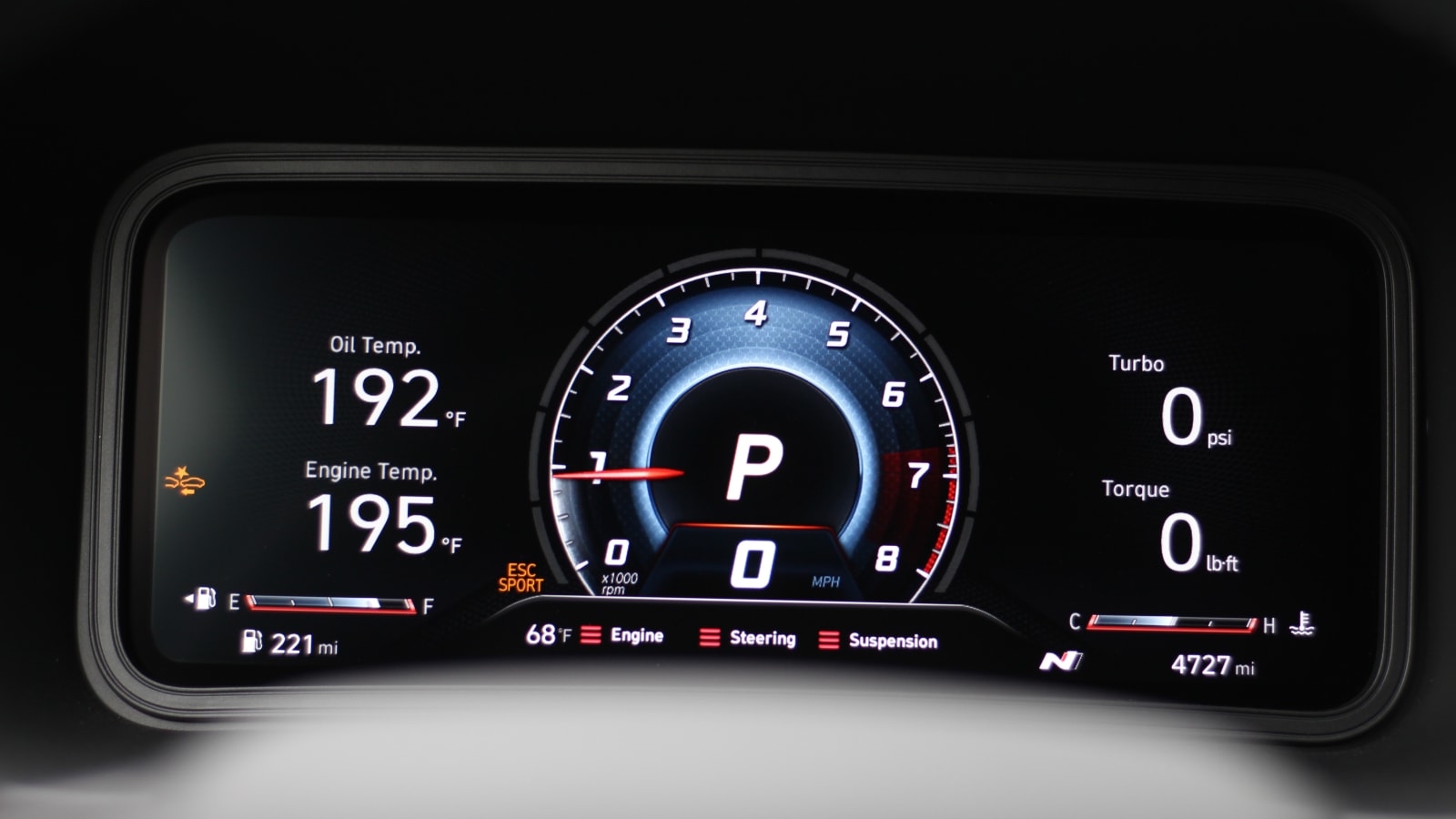 Beyond the theater of sound, the Kona N has fun enthusiast-oriented features like the “N Grin Shift” mode that gives you 20 seconds of extra performance via an overboost function (with 10 extra horsepower). It’s activated via a button on the steering wheel, just like Porsche’s “Sport Response” button, that’ll instantly ready the car for maximum performance. With N Grin Shift activated, Hyundai says the 0-62 mph sprint takes 6.4 seconds. You get there via the quick-shifting eight-speed dual-clutch automatic transmission. Said transmission is happy to be subjected to plenty of launch control starts, where the Kona N jumps off the line adeptly for a front-drive car. Just keep a tight hold on the wheel under acceleration to keep it pointed straight.