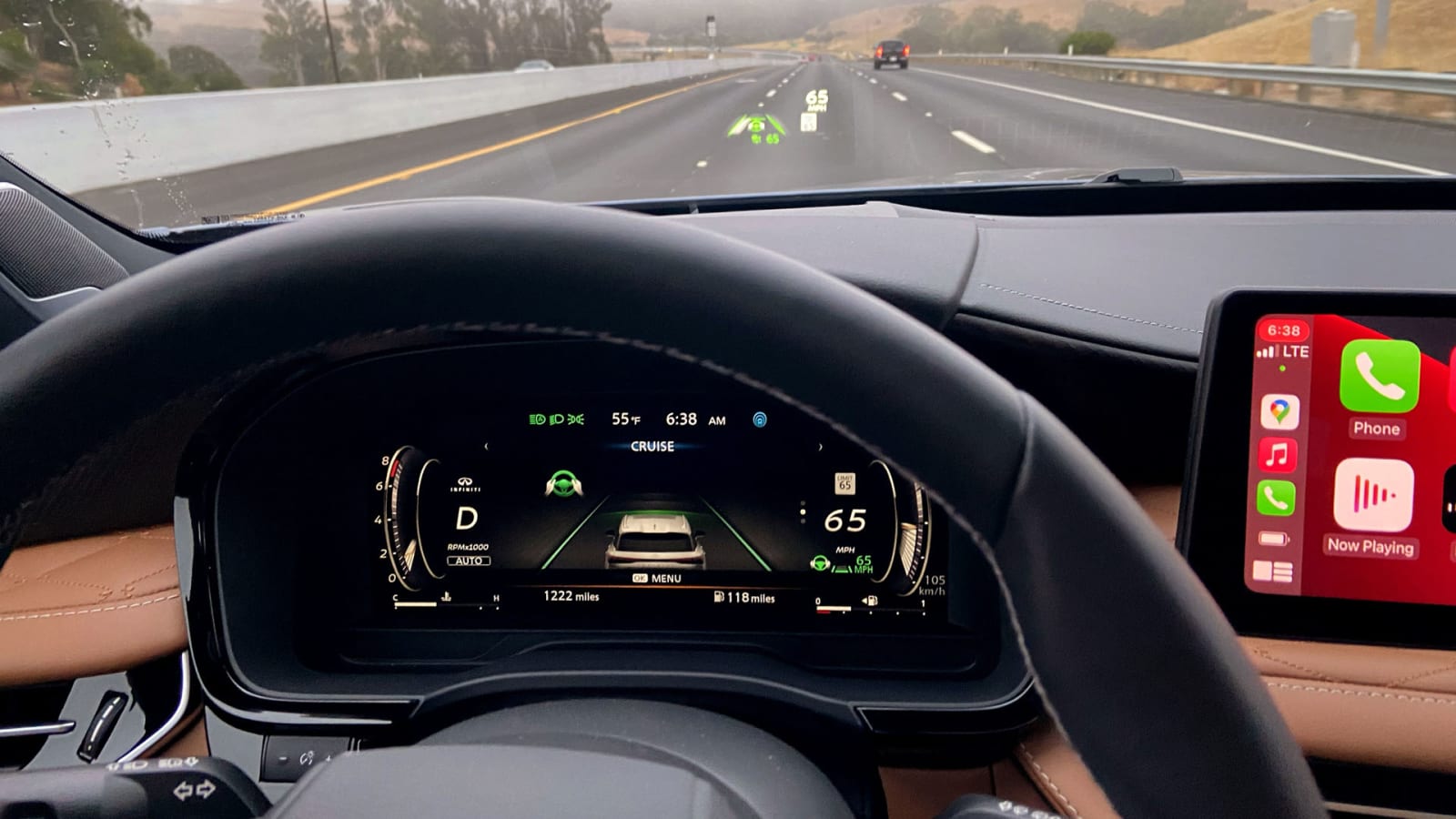 All QX60s feature a 12.3-inch touchscreen infotainment system. It runs the same infotainment suite that you find on Nissans, and that’s a good thing. The software features large, easy-to-find and easy-to-press icons. It all runs quickly and smoothly and is responsive to taps. We also appreciate that climate and audio controls have dedicated controls below the air vents. The volume and climate knobs are particularly appreciated, though a number of touch-sensitive buttons to control other climate items like the heated seats are frustrating to use. The base model QX60 also has analog gauges with a 7-inch information screen nestled between them. All other trims get a 12.3-inch digital instrument screen. Either option is clear and easy to read, but won’t ever come across as pushing tech boundaries.