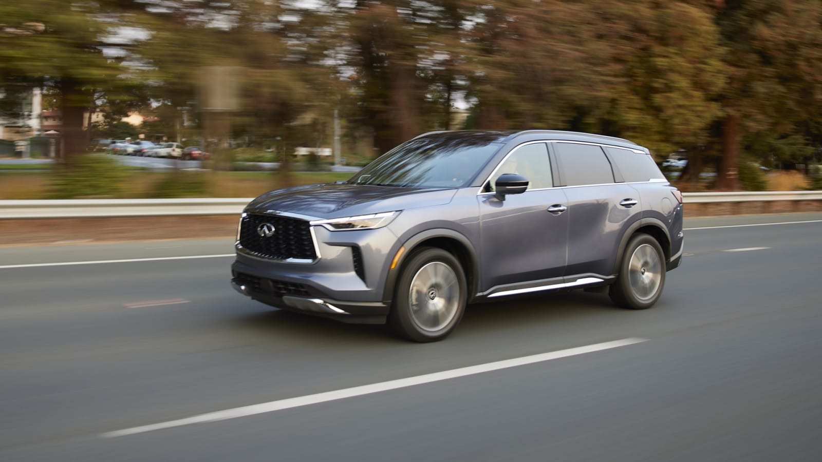 Noteworthy features on the Luxe include 20-inch wheels, silver metallic weave interior trim, the 12.3-inch digital instrument cluster, a 360-degree camera and Nissan/Infiniti’s excellent ProPilot driver assistance system. Step up the Sensory, and Infiniti throws in a “premium” leather-wrapped steering wheel, massaging front seats, wood trim, motion-activated hatch, second-row heated seats and the Bose 17-speaker premium sound system. The top-shelf Autograph really fancies up the interior with quilted and perforated semi-aniline leather upholstery, contrast stitching, a digital rearview mirror, head-up display and second-row captain’s chairs. Plus, you get a black-painted roof to contrast with whatever paint you choose.