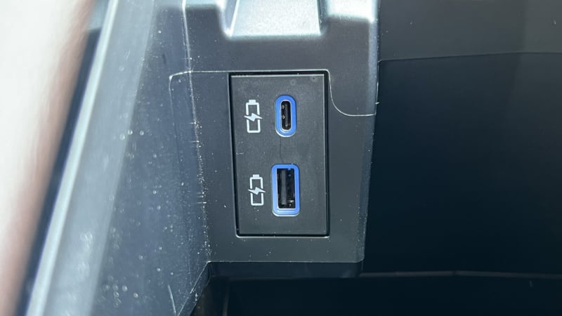 On the top rear of the center console are another USB-A and USB-C port under flip-up covers. Theres could be used either by front- or second-row passengers if their cords are long enough.