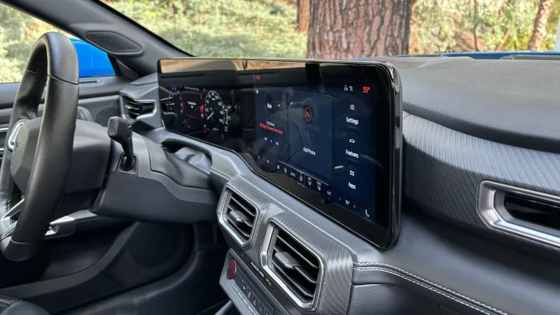 As for the 13.2-inch infotainment touchscreen, it runs off Ford’s existing Sync 4 architecture, but features an all-new interface and widescreen orientation. Ford got rid of most physical entertainment and climate controls because replacing them with touchscreen controls was “popular in research with Millenials, Gen-Z and traditional Mustang drivers alike.” Sure it was. Luckily, the climate controls and a bank of menu icons remain docked on the screen, including when using Apple CarPlay or Android Auto. As far as all-screen interiors go, this seems like one of the best. It really does look slick, too. A wireless charge pad is available, and a USB port can be added behind the rearview mirror for track cameras “and other devices.”