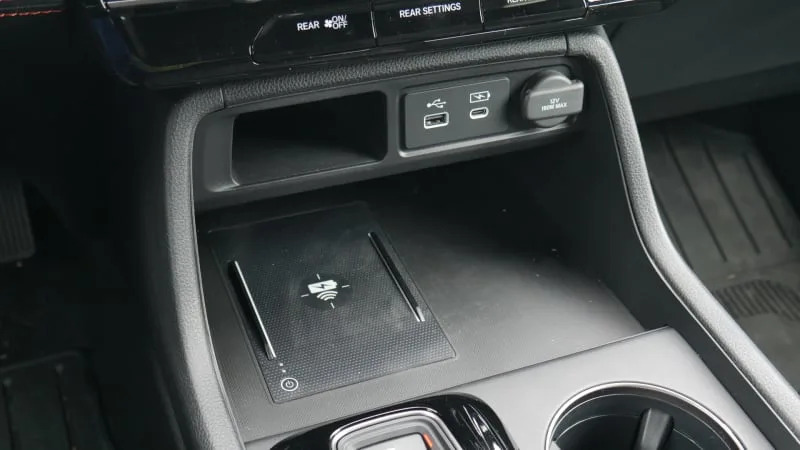 As for the TrailSport, it gets a unique suspension with a 1-inch lift (for a total ground clearance of 8.3 inches) and improved approach and departure angles. The stabilizer bars, spring rates and damper valve tuning are exclusive to the TrailSport, as are a full-size spare and the 18-inch wheels (stamped with TrailSport) wrapped in Continental TerrainContact all-terrain tires. Skid plates protect the oil pan, transmission and gas tank, and Honda says they can each support the entire weight of the Pilot crashing down on a rock. The result is a vehicle that’s remarkably capable for what is fundamentally little more than a minivan, though like the Pathfinder Rock Creek or Explorer Timberline, it’s not a particularly robust off-roader. It’s the sort of SUV that can bring you all the way to the trailhead, but it won’t let you blaze your own. On road, the TrailSport’s off-road tires do reduce steering precision, resulting in more steering corrections being needed on the highway (by you and the lane-centering steering assist system). Road-holding also degrades, but that’s less likely to be noticed in a family hauler. Pleasantly, the ride quality remains perfectly comfortable (unlike the Kia Telluride X-Pro that has the exact same tires) as does road noise. As a result, there’s minimal downside with going with the fun off-road model.