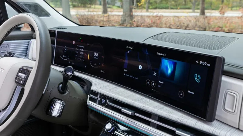 If you thought the Santa Fe’s exterior looked a little Defender-y, the cockpit will give you the same impression. The steering wheel looks like it was ripped right out of a Land Rover, as do the squared-off air vents and angled climate control screen flanked by temperature dials for the driver and passenger. The large center console area has two dedicated wireless charging pads for a pair of smartphones (an extreme rarity, in fact we’re struggling to think of another), and the cubby under the armrest opens from either the front or back, which sounds cool and functional, but you have to give the lid a good hard pull to get it to unlatch. This isn’t a weird pre-production quirk, either.