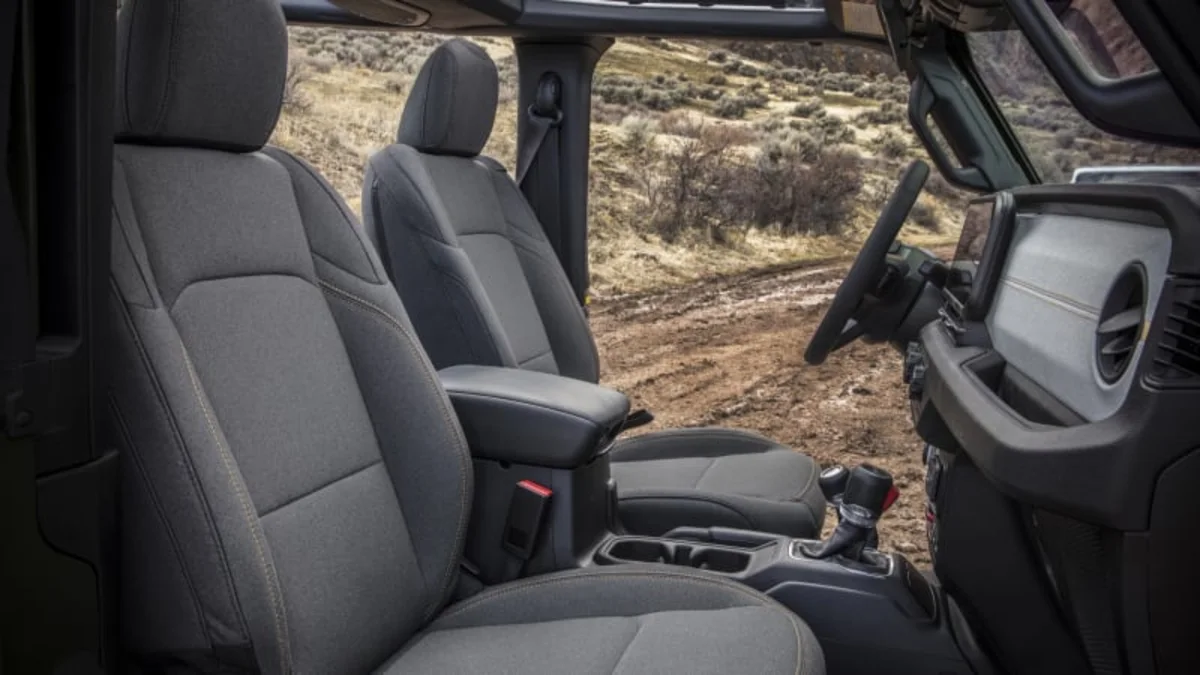 These old-school transfer cases are operated using equally old-school levers next to the floor-mounted shifter. Engaging four-wheel drive with a stiff pull feels reassuringly solid, and there’s a Neutral position that disengages the driveline, making the Wrangler a popular choice to tow behind recreational vehicles.