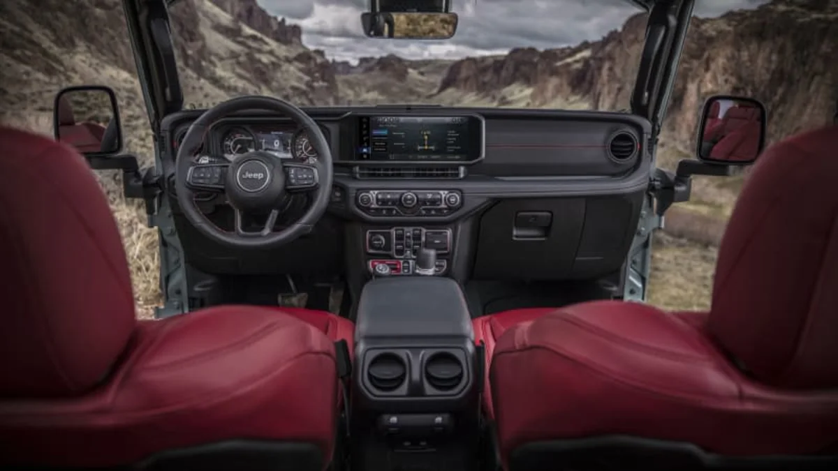 No matter which Wrangler model you’re after, the biggest usability upgrades for 2024 are inside (you can see the differences below). While the previous Wrangler’s dash looked chunky and playful, the new version is more refined. Each trim gets unique highlights and materials, some in cloth and some in a mixture of faux and real leather. Highlights include the Mantis Green of the High Altitude and the deep red inside the 392. Side curtain air bags are not only available for the first time, they are standard.