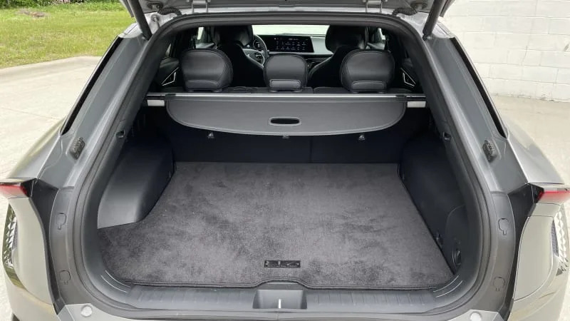 Cargo space turns out to be better than its official measurement of 24.4 cubic-feet behind its back seat. We could fit more luggage in the back than in the Hyundai Ioniq 5 and Mustang Mach-E despite both reporting more space on paper. All of the above EVs offer less than what you’d expect in a compact or midsize crossover SUV, however. In particular, the EV6’s racy roofline limits the height of any bulky objects you might fit back there.