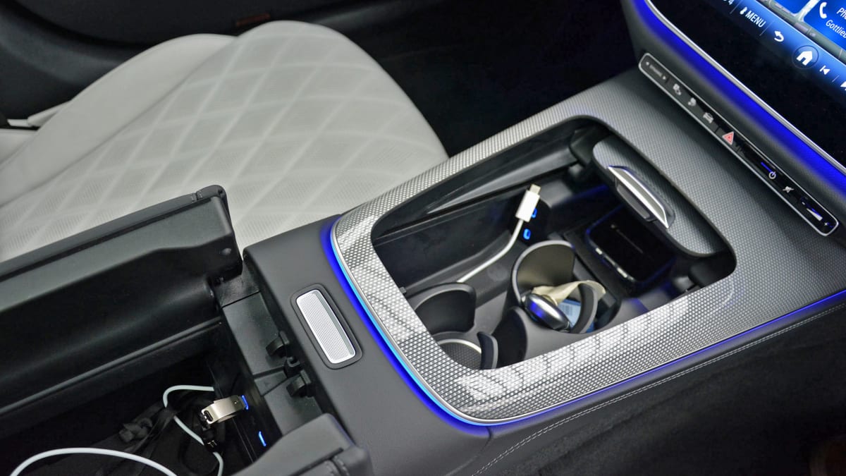One of the coolest interior features isn’t inspired by the past or fueled by 22nd century-like technology; it’s super simple and very clever. There are two storage compartments in the center console. One is located where the shifter was on a lot of older cars (it’s mounted on the column in the new E-Class), and the other is under the armrest. The charging ports live in the latter, but a tiny cable tunnel connects it to the former so you can charge your phone without opening the armrest or driving with the armrest open. Well done, Mercedes.